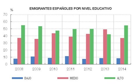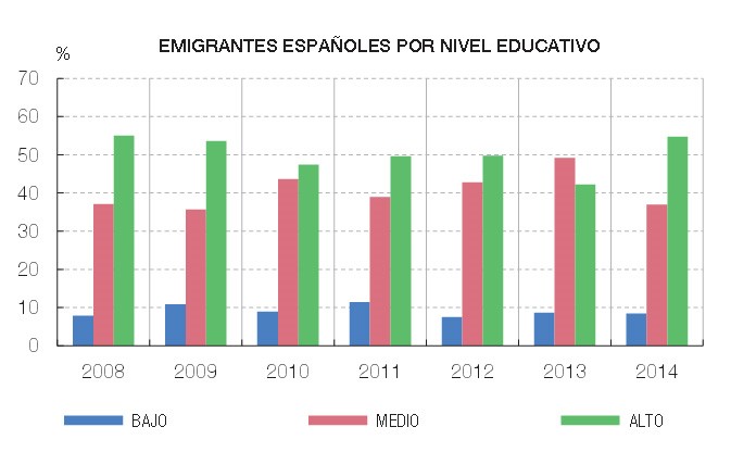 Otra cosa es el tipo de inmigrante. El Banco de España publica el siguiente gráfico, con los emigrantes por nivel educativo. Y puede verse como más del 50% de los que se han ido durante la crisis tienen un perfil alto (alcanzan el 90% si sumamos los de nivel medio). Es decir, al revés de lo que ha ocurrido en anteriores oleadas migratorias de nuestra historia, como la que se llevó a cientos de miles de españoles a Bélgica, Suiza, Francia o Alemania en los años 50 y 60, los que están saliendo ahora son los más preparados, titulados universitarios especialmente.