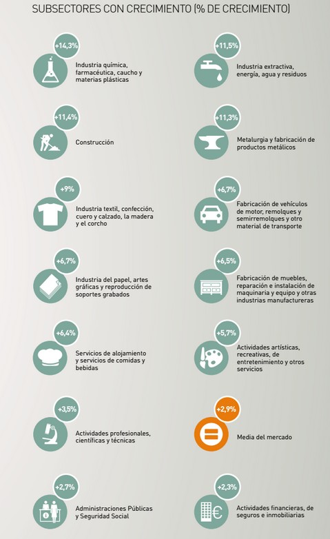 Pero lo destacado es que en términos relativos, en porcentaje, el sector de la industria que engloba la química, farmacéutica, caucho y materiales plásticos, ha sido el que ha generado un mayor incremento en el periodo con un crecimiento del 14,3%.