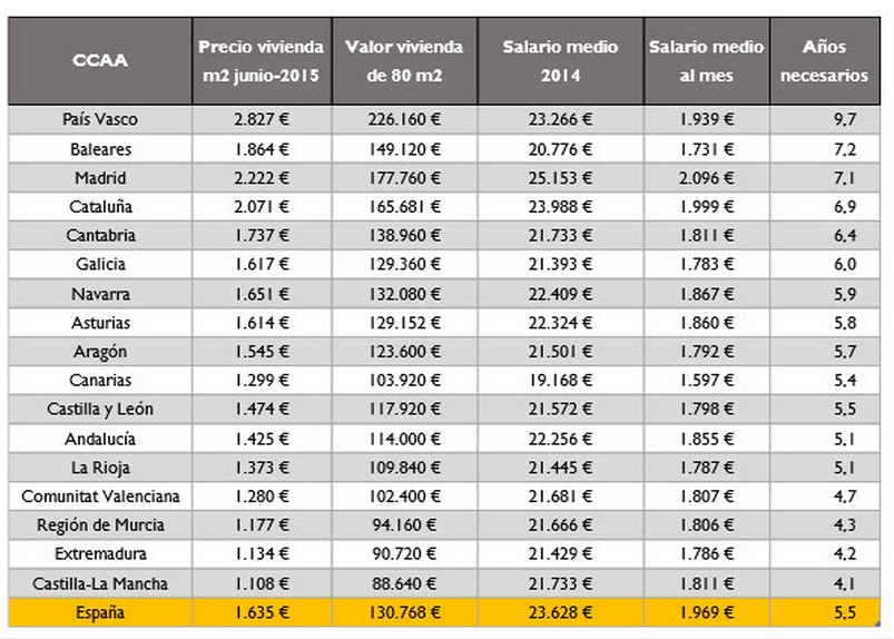 Por comunidades, País Vasco lidera el ranking como la comunidad en la que más tiempo se tarda en pagar una vivienda (9,7 años) con un precio medio de la vivienda en junio de 2.827 €/m2. Baleares es la segunda, con un plazo medio de 7,2 años y un precio medio de 1.864 €/m2. Le siguen Madrid (7,1 años), Cataluña, (6,9 años), Cantabria (6,4 años) y Galicia (6 años). En el lado contrario de la tabla están Castilla-La Mancha (4,1 años), Extremadura (4,2) y Murcia (4,3).