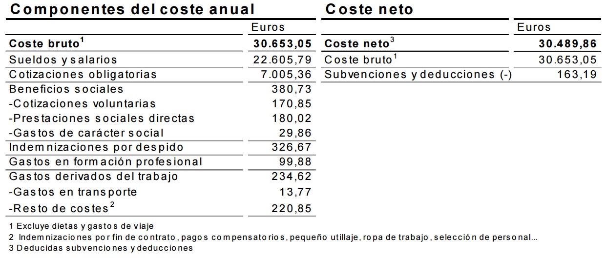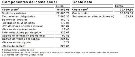 Como vemos, el coste bruto de 30.653 euros (165 euros menos si se eliminan las subvenciones y deducciones) pasa a apenas 22.605 euros de sueldos y salarios. Por el camino se quedan 8.000 euros, entre cotizaciones(unos 7.000 euros), beneficios sociales, indemnizaciones y gastos derivados del propio trabajo.