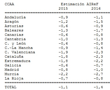 El siguiente cuadro recoge, por comunidades autónomas, la necesidad de financiación en 2015 y 2016, según la AIReF: