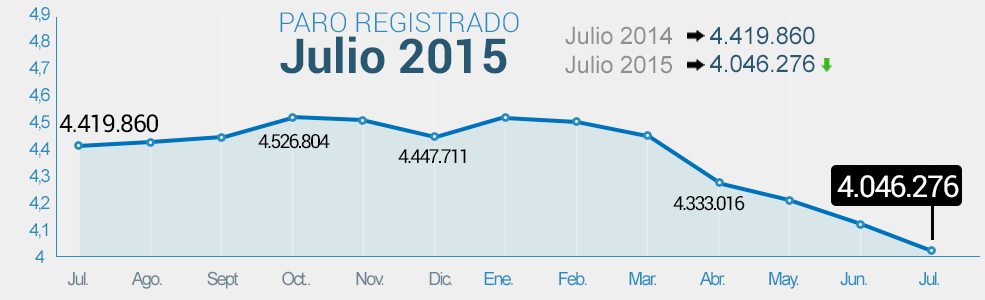 La buena evolución del mercado laboral sigue jugando a favor del Gobierno de Mariano Rajoy. El pasado mes de julio ha vuelto a arrojar datos positivos en materia de paro y de creación de empleo. Como consecuencia, España registra hoy un total de 4.046.276 desempleados, 376.083 parados menos que en diciembre de 2011, cuando el PP llegó al poder, y la cifra más baja desde septiembre de 2010. Además, el número de afiliados a la Seguridad Social asciende a 17.315.188 personas, unos 85.400 más que al inicio de legislatura, regresando así a niveles de octubre de 2011.