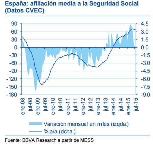 Sin embargo, en el lado negativo, el dato de julio avanza una evolución del empleo menos dinámica que la registrada en la primera mitad del año. Así, cuando se corrigen las cifras de las variaciones estacionales y del efecto calendario, BBVA Research estima que la afiliación creció en torno a 18.000 personas que, lo cual, aunque supera en 5.000 el registro de junio, confirma la desaceleración respecto al primer semestre del año (50.000 personas en promedio), tal y como refleja el siguiente gráfico.