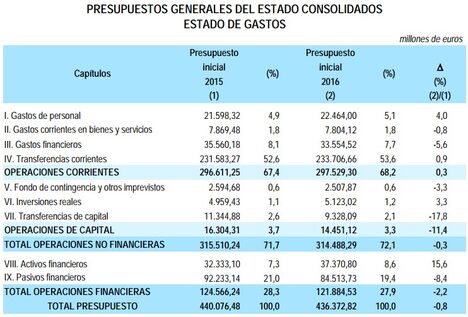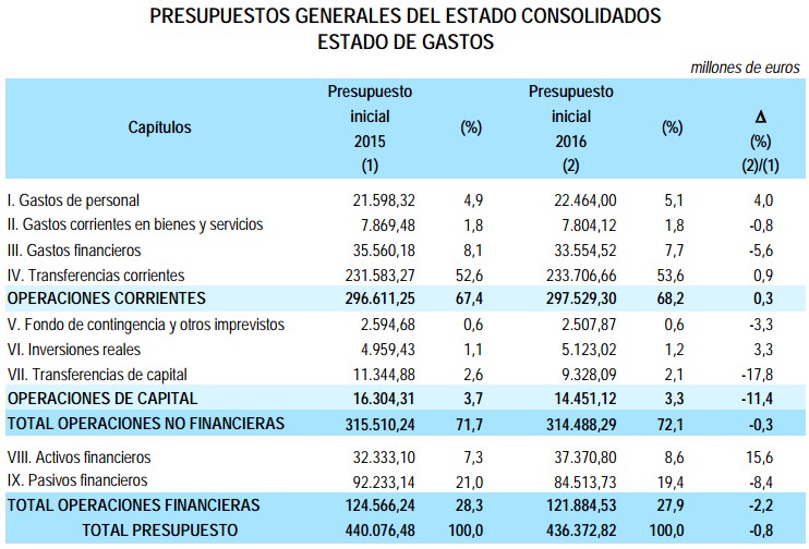 Dichas cifras se recogen en los denominados "Presupuestos consolidados". Así, el Estado gastará un total de 436.372,82 millones de euros en 2016, un 0,8% menos que en el presupuesto inicial de 2015.