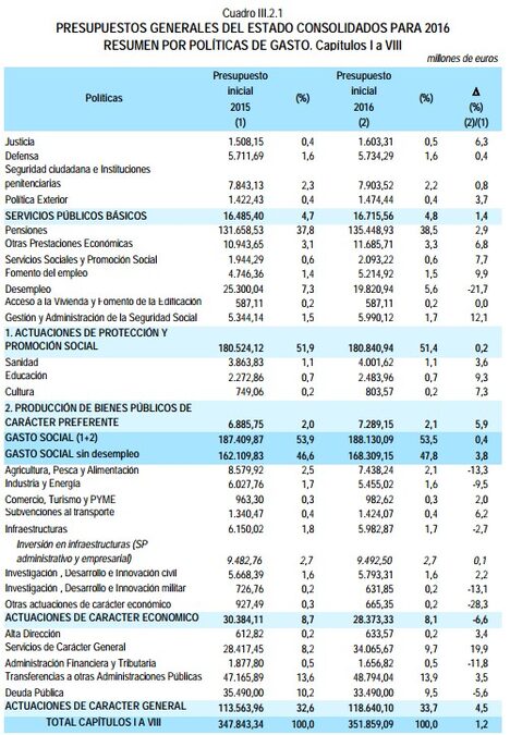 Una vez descontada dicha partida, se obtiene el gasto consolidado real del Estado en cada ejercicio (capítulos I a VIII de los PGE), cuya cuantía ascenderá a 351.859 millones, casi 4.000 millones de euros más que en 2015, lo que supone un incremento del 1,2%.