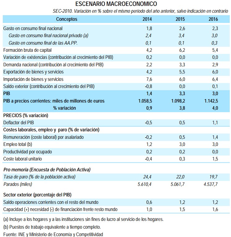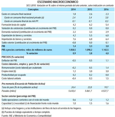Las grandes cifras de los PGE se asientan, como siempre, en las previsiones económicas del Gobierno. El cuadro macro que acompaña al proyecto presupuestario de 2016 estima, por un lado, que el PIB registrará un crecimiento medio del 3% en 2016, mientras que la tasa de paro (EPA) bajará del 22% al 19,7% (unos 500.000 desempleados menos).