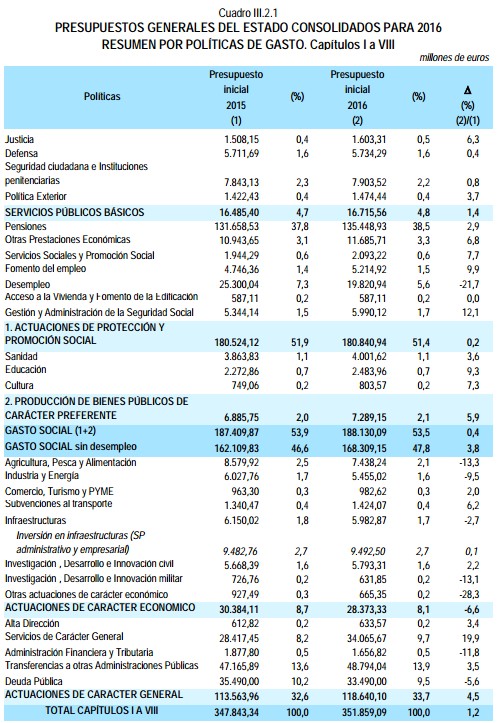 - Servicios Públicos: incluye el presupuesto de Justicia, Defensa, Seguridad e Instituciones Penitenciarias y Política Exterior. El gasto previsto para 2016 alcanza un importe de 16.715,56 millones de euros (+1,4%).