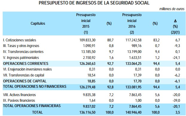 Según los PGE presentados el pasado martes en el Congreso, los ingresos no financieros de la Seguridad Social subirán un 5,4% respecto a 2015, hasta los 133.064 millones de euros, mientras que los gastos sumarán 136.826 millones, un 3,1% más, de modo que el sistema registraría un déficit equivalente al 0,3% del PIB.
