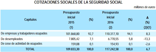 De este modo, las cotizaciones que pagan trabajadores y empresas ascenderán, en realidad, a 110.317 millones, un 8,3% más gracias a la evolución positiva que está experimentando la afiliación desde 2014, tanto en el Régimen General como en el especial de trabajadores autónomos y se prevé que se mantenga en 2016.