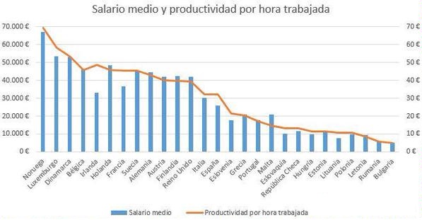 Así, como vemos en la siguiente gráfica elaborada por Juan Ramón Rallo, el salario medio (barra azul) y la productividad por hora trabajada (línea verde) guardan una estrecha correlación en la gran mayoría de países europeos. Por tanto, si bien es cierto que los españoles cobran menos que británicos, alemanes, franceses u holandeses, también es cierto que su productividad es más baja.