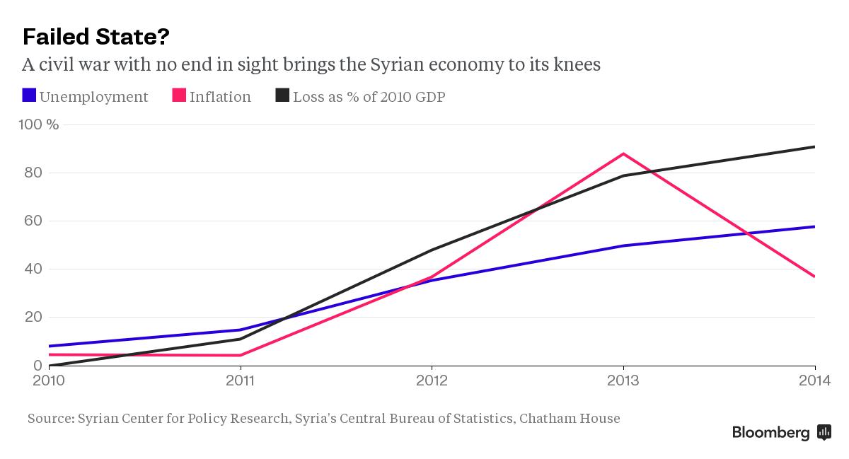 Este fuerte deterioro de la actividad económica siria significa que el PIB del país en 2014 sea ya un 100% más bajo que el registrado cuatro años antes, en 2010. Un desplome profundo y generalizado que ha dejado a Siria en una clara situación de colapso socioeconómico.