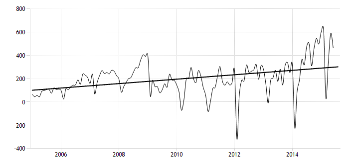 Por otro lado, la posición económica china tiene otra fortaleza estructural en su capacidad exportadora. La tendencia observada en los últimos diez años es claramente positiva, como refleja su creciente superávit en la balanza comercial: