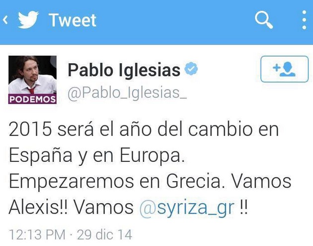 Finales de 2014. El líder de Podemos, Pablo Iglesias, se mostraba eufórico ante la más que previsible victoria electoral de su "amigo" y colega ideológico Alexis Tsipras, máximo representante de la coalición de extrema izquierda Syriza en Grecia.