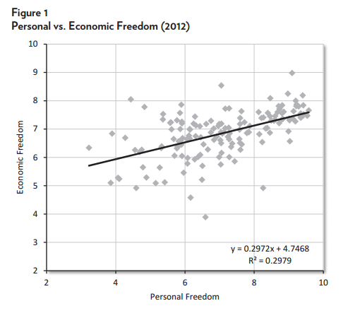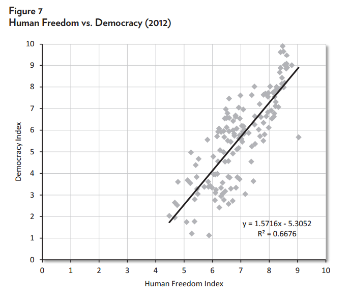 El vínculo también es muy fuerte entre el grado de libertad personal y la puntuación obtenida por cada país en los índices de democratización.