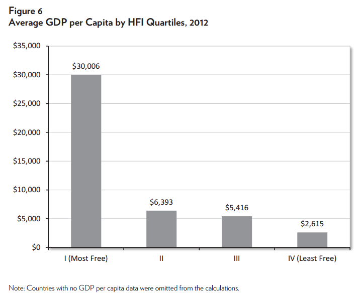 De hecho, si dividimos a los países en cuatro grupos según el grado de libertad personal que registran en el estudio, vemos que el ingreso per cápita es mucho mayor donde el resultado alcanzado es más alto: