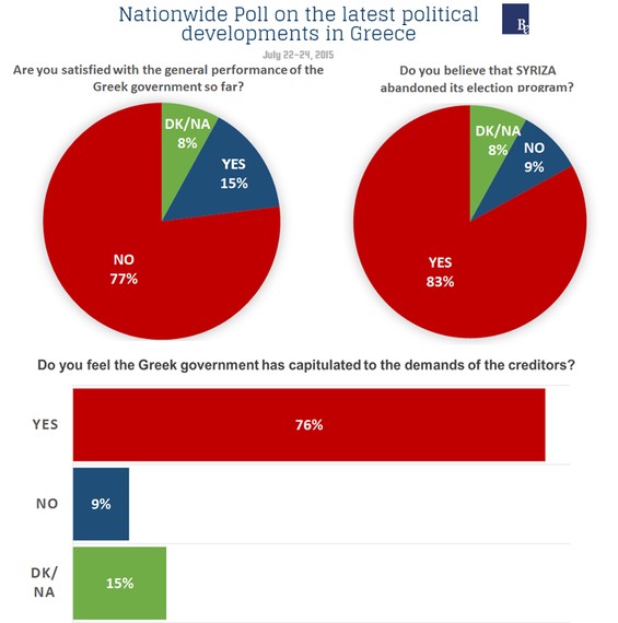 Según las últimas encuestas disponibles, el 77% de los griegos está descontento con la actuación del Gobierno Gobierno, el 83% coincide en que Syriza ha incumplido su programa electoral, y hasta un 76% admite que Tsipras ha capitulado ante la troika.