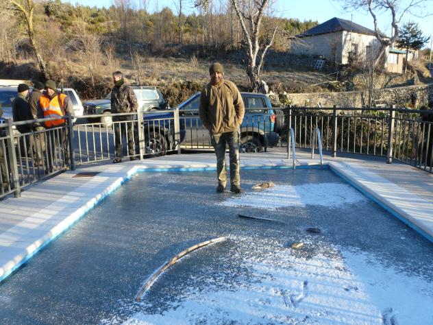 Perdido en la montaña, es probable que sus 30 habitantes ni siquiera dispongan de internet. En la foto, el alcalde probando el primero la resistencia del hielo en la piscina.