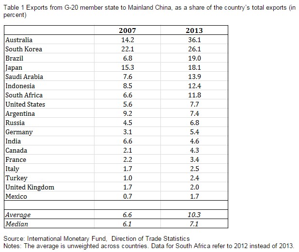 La siguiente tabla refleja el volumen de exportaciones que los países del G-20 destinan a China, cuya media representa más del 10% de las ventas totales al exterior, aunque las economías más expuestas son Australia, Corea del Sur y Brasil, con el 20% o más de sus exportaciones dependientes del gigante asiático.