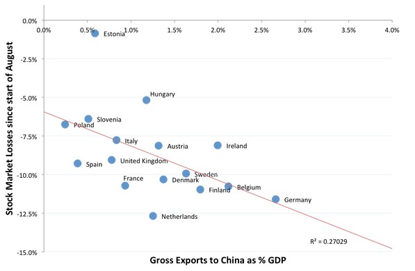 De ahí, precisamente, que exista cierta correlación entre las caídas bursátiles sufridas en agosto por parte de las bolsas europeas y el volumen de exportaciones dependiente de China.