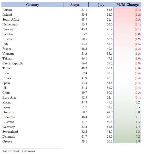 Una nota por encima de 50 marca expansión y por debajo contracción de la actividad industrial. Un total de diez economías ya han entrado en terreno negativo.