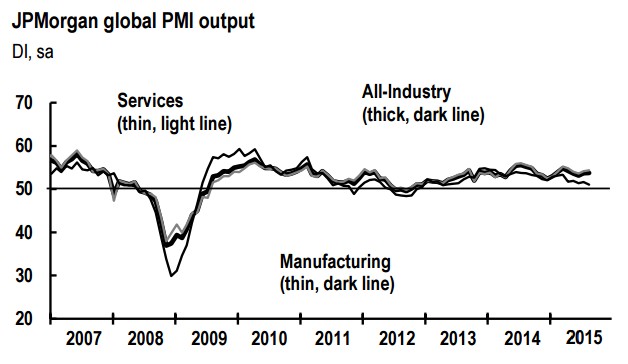 Por el momento, la actividad económica a nivel mundial se ha mantenido más o menos estable desde julio gracias al tirón de las economías desarrolladas, empezando por EEUU y la zona euro, pero las potencias emergentes siguen mostrando debilidad, tal y como muestra el siguiente gráfico elaborado por Markit y J.P. Morgan. La economía de Asia tendría que mejorar de forma sustancial de aquí a cierre de año para que el crecimiento global de 2015 acabe superando el resultado obtenido en 2014.