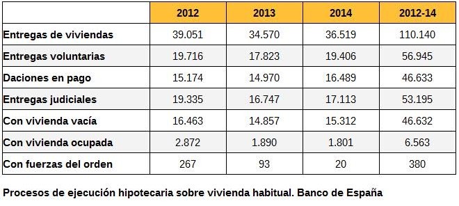 Para un análisis más detallado podemos acudir al Banco de España, que desglosa entre viviendas y otro tipo de inmuebles. Es cierto, por un lado, que el BdE no recoge todo lo ocurrido durante la crisis puesto que le faltan los tres años que van de comienzos de 2009 a 2012. Por otro lado, éstas son estadísticas que presentan un cierto retraso respecto a las causas que las motivaron. La mayoría de los desahucios o desalojos hipotecarios suponen un proceso de varios años, por lo que muchos de los iniciados al comienzo de la crisis se habrán ejecutado a partir de 2011-2012. Del mismo modo, muchas familias que perdieron sus principales fuentes de ingresos en 2008 y 2009 intentaron mantenerse al día de sus obligaciones financiera a base de ahorros; sólo cuando estos se acabaron comenzó su proceso de ejecución hipotecaria.