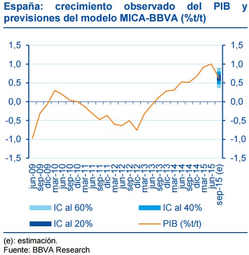 El Servicio de Estudios de BBVA mantiene, por un lado, que España crecerá un 3,2% en el conjunto del año, pero el PIB nacional se desacelerará en el segundo semestre, entre otras cosas, por las menores expectativas de crecimiento de China y su impacto en otros mercados, y la previsible subida de tipos de la Reserva Federal estadounidense, que ve "cada vez más cerca".