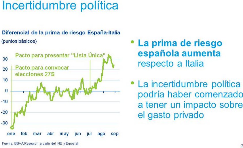 Estas expectativas se podrían estar reflejando en la evolución de la prima de riesgo, en tanto que muestra la percepción de incertidumbre. El economista jefe del BBVA Research ha precisado que al comparar la prima de riesgo española con la de Italia se puede descartar, por ejemplo, el efecto de la crisis Griega, ya que sería común a ambos países y quedaría anulado.