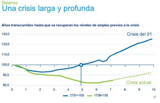 Así pues, si se mantuviera en el tiempo el actual ritmo de crecimiento del PIB, próximo al 3% anual, España tendría que esperar hasta 2020 e incluso algún año más para recuperar todo el empleo perdido durante la crisis. Es decir, más de diez años para superar de nuevo el umbral de los 20 millones de ocupados, más del doble que el tiempo registrado durante la anterior crisis de principios de los años 90, lo cual demuestra la intensidad y profundidad de la caída.