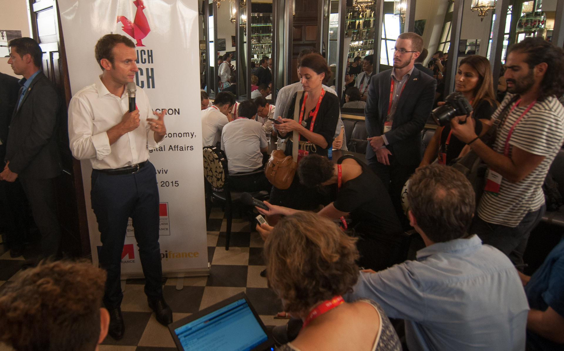 El influyente colega de Manuel Valls participó en una conferencia y dialogó después con unos cuantos periodistas en la cafetería del evento. Macron presentó La French Tech, una iniciativa desarrollada por su departamento "para ayudar a los emprendedores franceses en Israel y conectarlos con grandes compañías francesas que buscan ese talento". La telefónica Orange, por ejemplo, era una de las firmas presentes en el encuentro.