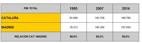 En 1995, el PIB catalán, próximo a los 86.000 millones de euros, tan sólo superaba al de Madrid en 9.600 millones (un 12,5% más). Mientras, en 2007, en el punto álgido de la burbuja crediticia, la distancia entre una y otra ya se había reducido a menos de la mitad (un 5% más a favor de Cataluña). Durante la crisis, y en pleno órdago secesionista, este particular proceso de convergencia ha continuado su curso, de modo que a cierre de 2014, el PIB catalán tan sólo superaba en unos 2.000 millones al madrileño, un 0,5% más... aunque Cataluña tiene un millón de habitantes más.