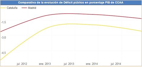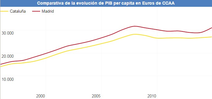 Como resultado, el peso de ambas regiones en la riqueza nacional también ha cambiado de forma paulatina: en el año 2000, Cataluña representaba el 18,9% del PIB de España, mientras que el de Madrid ya ascendía al 17,7%; en 2007, la primera seguía estancada en el 18,8% frente al 18% de la segunda; mientras que en 2014 esta diferencia se reducía a sólo dos décimas porcentuales, con un 18,9% y un 18,7% del PIB nacional, respectivamente.