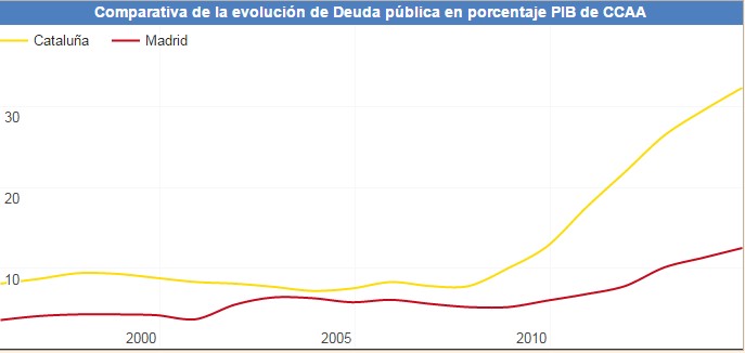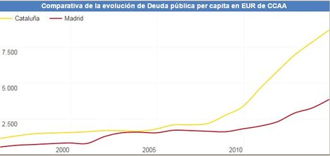 No es de extrañar, por tanto, que la deuda pública catalana se haya más que triplicado desde 2007, hasta superar el 32% del PIB regional en 2014 frente al 12,5% de Madrid. Y eso que Madrid contribuye al sistema de financiación autonómica bastante más que Cataluña. Cada madrileño aporta a la caja común tres veces más de media que cada catalán. Algo lógico, en cierto sentido: como son más ricos, ganan más y pagan impu