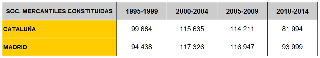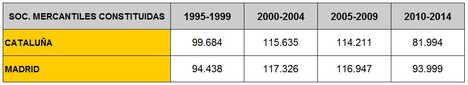 Pues bien, esto está cambiando. Según los datos del INE de Sociedades Mercantiles constituidas, en los años 90 (la estadística comienza en 1995) en Cataluña se creaban más empresas que en Madrid: 99.684 frente a 94.438 entre 1995 y 1999. Son datos que tienen sentido, teniendo en cuenta que hay más de un millón de habitantes de diferencia entre una y otra.
