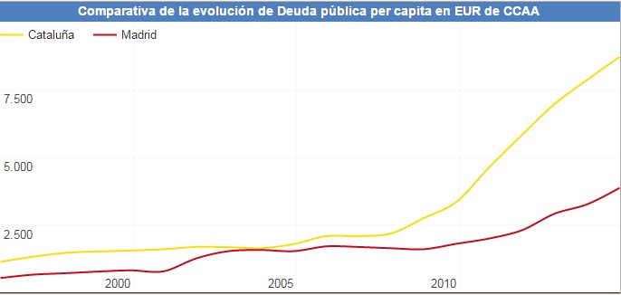 En la actualidad, la deuda regional se traduce en una factura de más de 8.700 euros por cada catalán frente a los 3.780 de cada madrileño.