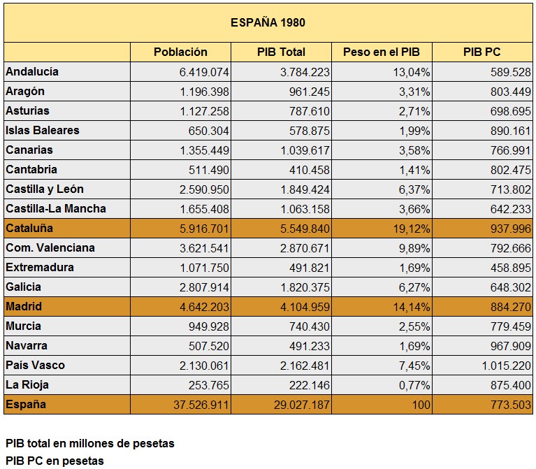 Así, en 1980, Cataluña era, de lejos, la autonomía de régimen común más rica de España en términos absolutos: según los datos del INE su PIB total rozaba los 5,5 billones de las antiguas pesetas, un 35% más que el de Madrid. Su economía representaba entonces el 19,1% del conjunto de la riqueza nacional frente al 14,1% de Madrid; y su renta per cápita rondaba las 938.000 pesetas anuales, de modo que los catalanes ganaban de media un 6% más que los madrileños. Y todo ello con una diferencia poblacional de 1,3 millones de personas a favor de Cataluña.