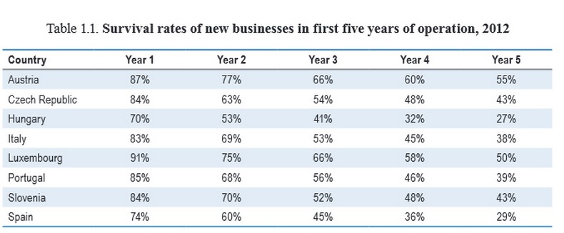 En el otro lado de la tabla se sitúa Austria, donde el 45% de sus empresas continúa activa después de cinco años. En segundo lugar, están las empresas de Luxemburgo, que sobreviven la mitad.