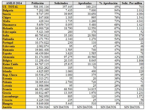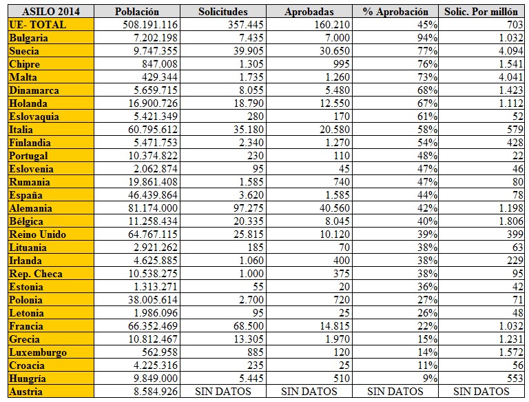 En la siguiente tabla, aparecen las cifras de solicitantes del derecho de asilo a lo largo del año 2014 según los datos de Eurostat. Como vemos, Alemania es el destino más buscado y también el que más peticiones acepta en términos absolutos. Pero no es el más generoso en términos relativos. Entre los países ricos que reciben más peticiones, es Suecia el que más fácilmente acepta las peticiones (un 77% de porcentaje de reconocimiento de la condición de asilado en primera instancia).