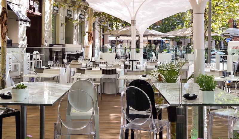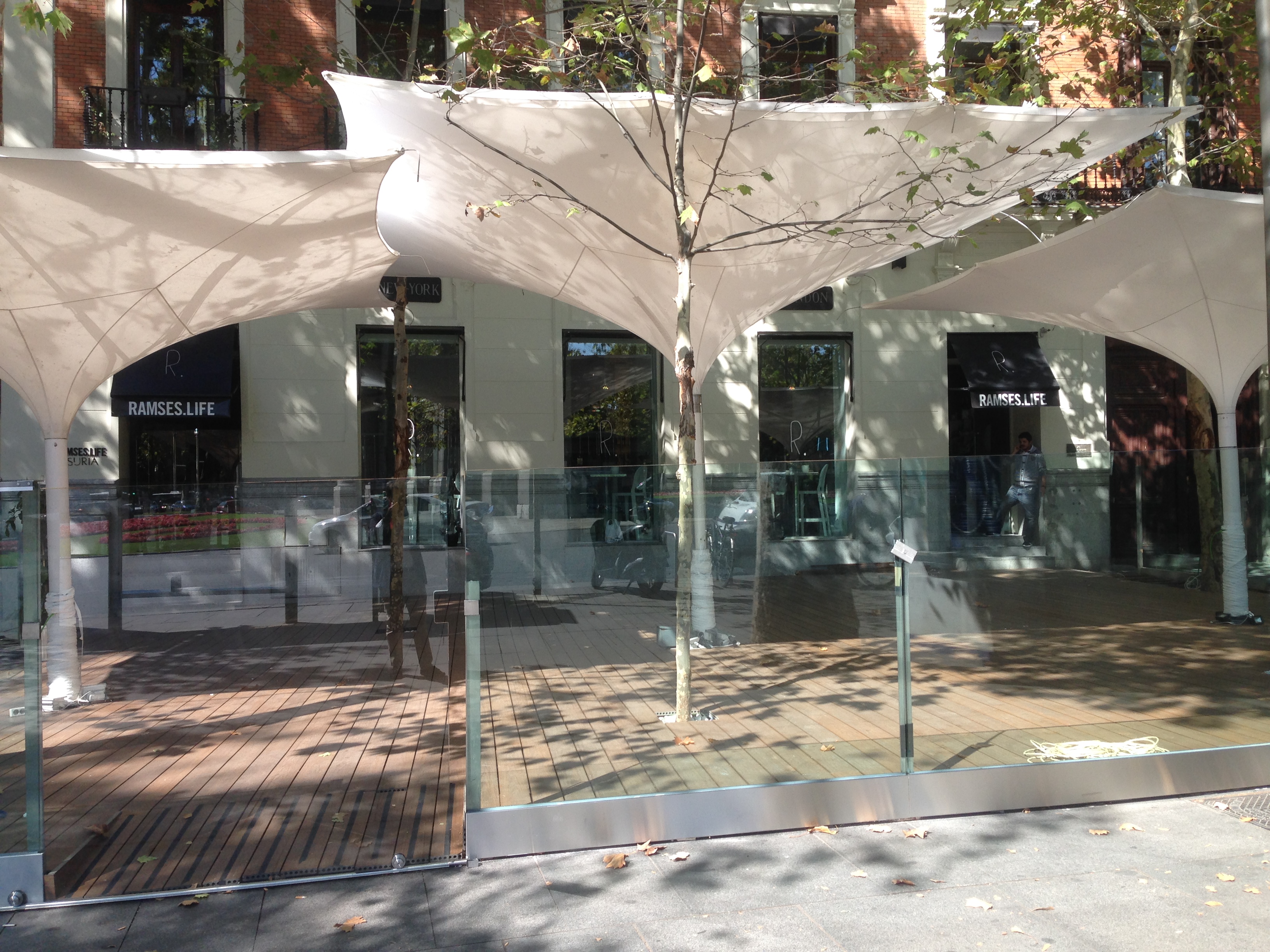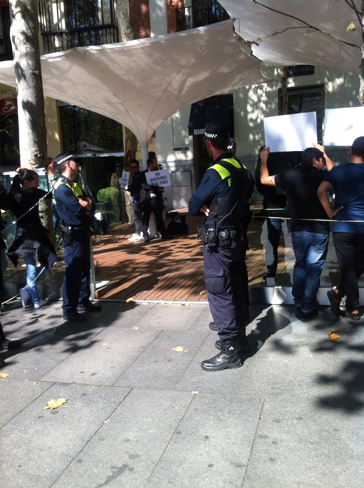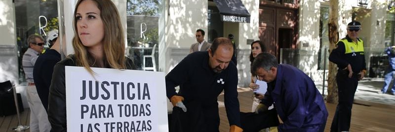 Trabajadores del restaurante Ramses de Madrid, ubicado en las proximidades de la Puerta de Alcalá, se encadenaron a la terraza del local para evitar que operarios del Ayuntamiento la desmantelen.