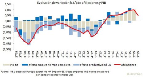Así pues, el mercado de trabajo arroja una de cal y otra de arena. Por un lado, los últimos indicadores avanzan un menor crecimiento económico en el tercer y el cuarto trimestre del año, desde el 1% alcanzado entre abril y junio hasta el 0,8% o 0,7% que ya empiezan a barajar la mayoría de analistas hasta el cierre del ejercicio.