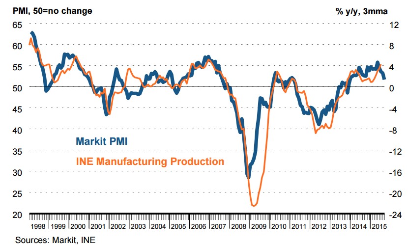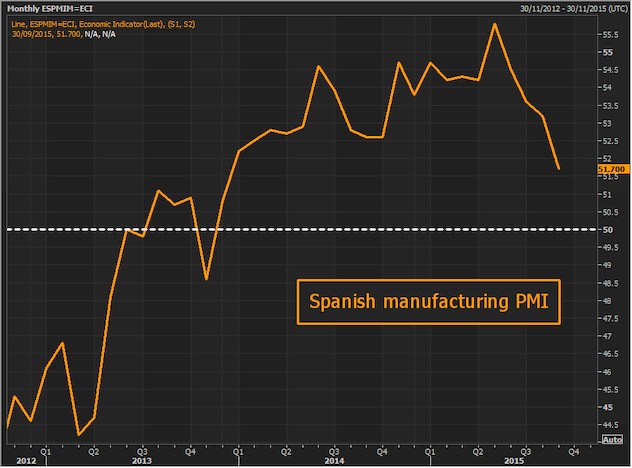 El crecimiento del sector manufacturero español registró una nueva desaceleración en septiembre, situándose en 51,7 puntos frente a los 53,2 de agosto, el cuarto mes consecutivo a la baja, debido a que los nuevos pedidos aumentaron al menor ritmo desde finales de 2013, según el índice PMI publicado el jueves por Markit. Un indicador por encima de 50 puntos señala expansión y por debajo contracción de la actividad.