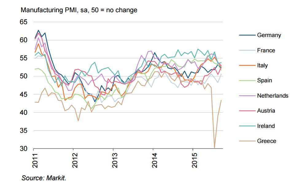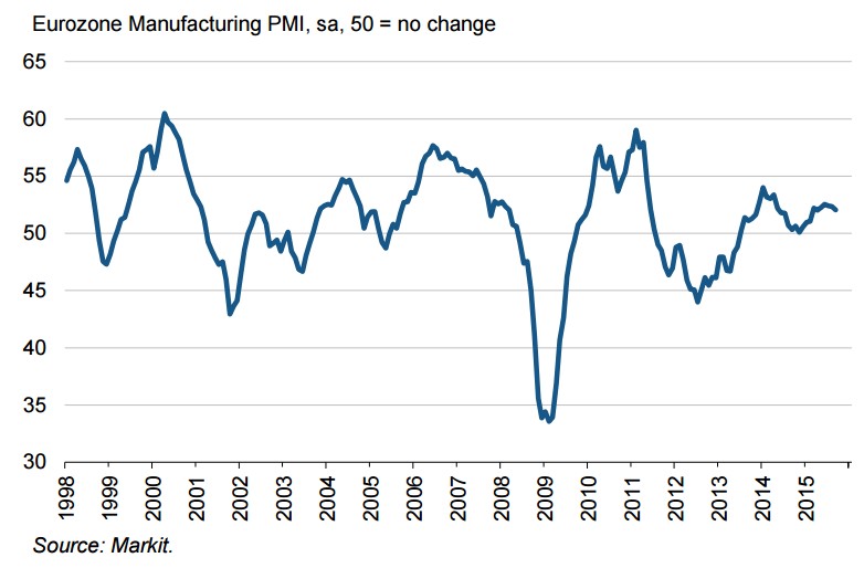 El economista jefe de Markit, Chris Williamson, advierte de que a pesar de los estímulos monetarios del Banco Central Europeo (BCE) y la depreciación del euro, el sector manufacturero de la zona euro está fallando en lograr un "impulso significativo" en el crecimiento y, de hecho, se atisban nuevos "riesgos de estancamiento". La debilidad de la actividad industrial avanzaría un modesto crecimiento del 0,4% del PIB de la zona euro en el tercer trimestre.