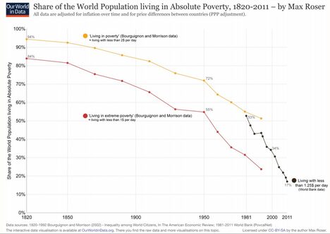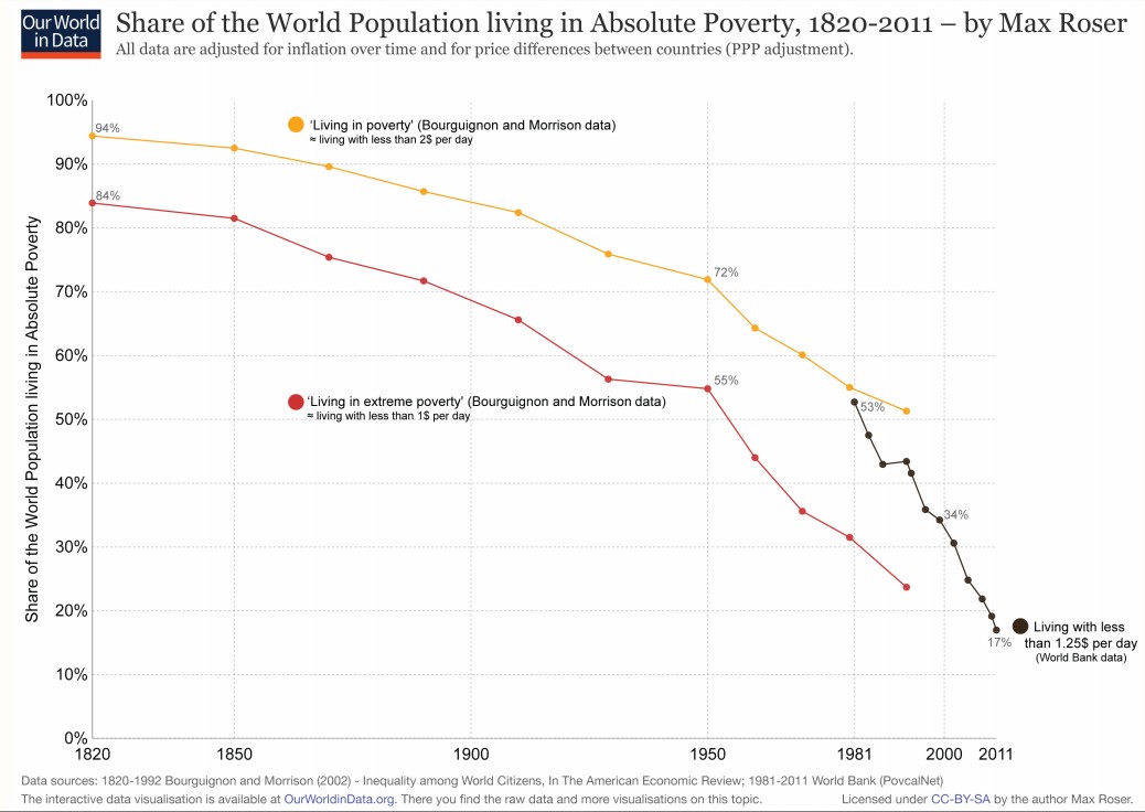 En este sentido, lo primero que hay que aclarar es que lo normal es la pobreza, no la riqueza. Desde que se tiene noticia, la gran mayoría de la humanidad ha vivido en condiciones de acuciante necesidad. En 1800, más del 90% de la población mundial vivía con menos de 1 dólar al día (en términos reales). Sólo en algunos pocos países de Europa y América del Norte comenzaba a intuirse en embrión de la clase media. Es que incluso los ricos de aquella época tenían en muchos aspectos un nivel de vida peor que el del ciudadano medio europeo de la actualidad: esperanza de vida, consumo de calorías, variedad alimenticia, oferta de ocio a su disposición, comodidades en sus hogares, etc., En cualquiera de estas variables, nuestra situación es mejor que la de los potentados de 1800.