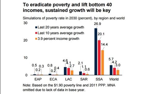 Por eso, que la población siga creciendo, como se supone que hará en las próximas décadas no sólo no es una mala noticia, sino que nos acerca al objetivo de los organismos internacionales de reducir la tasa de pobreza extrema por debajo del 3% en 2030. Es el nivel por debajo del cual el Banco Mundial cree que se podría hablar por primera vez de fin de la pobreza. Como podemos ver en el siguiente gráfico, no será sencillo de alcanzar. El mundo tendría que crecer de media al menos al 4% en los próximos 15 años. Hay numerosos riesgos en el horizonte: inestabilidad en los emergentes, precios de las materias primas, tensión geopolítica,… Pero por primera vez, el objetivo está a nuestro alcance.