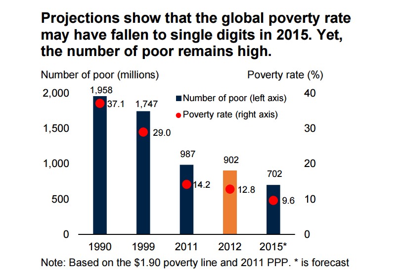 Este domingo, el Banco Mundial publicaba sus previsiones para este año y anunciaba un hito que es una de las mejores noticias que puedan imaginarse: si todo se mantiene según lo previsto, a finales de 2015 menos del 10% de la población mundial estará por debajo de la línea de la pobreza extrema. Son 700 millones de personas, por lo que no se puede caer en la complacencia. Pero nunca antes el porcentaje de los que pasan privaciones severas fue tan pequeño.