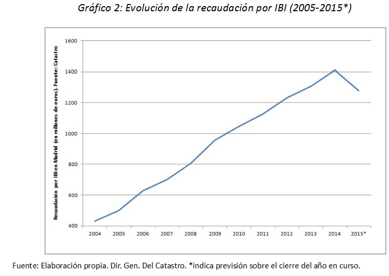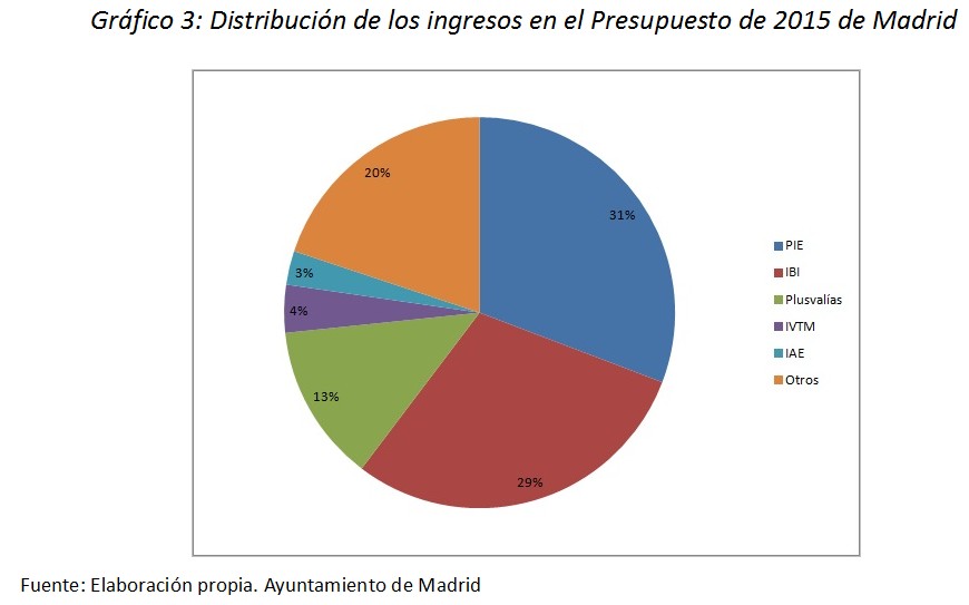 Sin embargo, el mantenimiento del superávit en las cotas actuales es ciertamente complicado a la luz de las previsiones de ingresos y gastos para el cierre de 2015. Según el Presupuesto de 2015, el incremento de casi un 2% en la Participación en Ingresos del Estado (PIE) no compensa la caída del resto de los ingresos, especialmente del Impuesto de Bienes Inmuebles (IBI), cuya recaudación caerá un 3,5%.