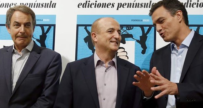 El exministro socialista de Industria Miguel Sebastián presentó ayer su libro La Falsa Bonanza. José Luis Rodríguez Zapatero y Pedro Sánchez acudieron a la cita y se hicieron la foto con Sebastián.