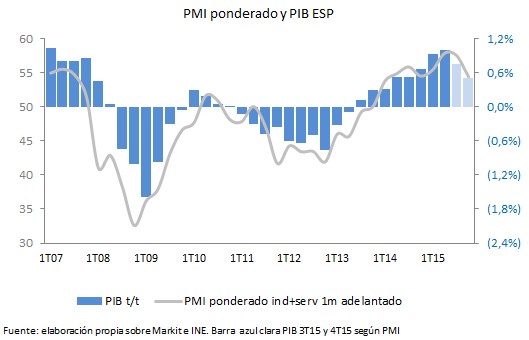 Así, aunque todavía no están disponibles todos los datos, si se adelanta un mes la serie de los PMI de manufacturas y servicios, el PIB apunta a una mayor ralentización entre octubre y diciembre, desde el 1% del segundo trimestre y el 0,7%-0,8% del tercero hasta el 0,5% del cuarto, tal y como muestra el siguiente gráfico elaborado por el economista Javier García Echegaray.