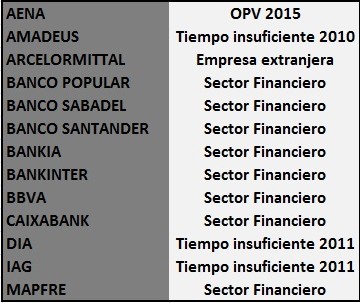 Quiet Investment no participa en el análisis del sector financiero y eso excluye a los 7 bancos y a la aseguradora, MAPFRE, que forman parte del IBEX 35. Por otro lado, AENA es una OPV del 2015 y no es valorable en este sentido.
