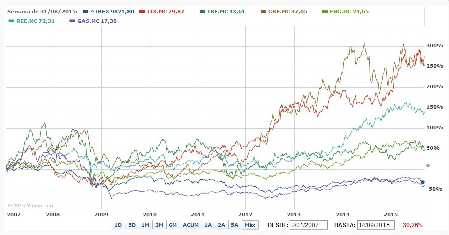Finalmente, el incremento de los beneficios acompaña la mayor parte de las veces al incremento de las cotizaciones. Salvo para GAS NATURAL, cuyas ganancias han aumentado muy levemente, esto es una realidad. Aquí tienen al IBEX 35 sin dividendos, dejándose un 30% en ocho años. Hay cinco samurais que trocean con sus catanas esta mediocre performance.